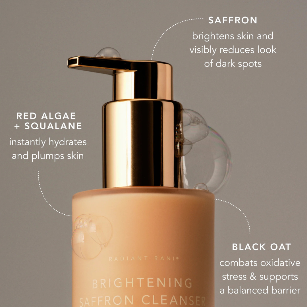 Ranavat Brightening Saffron Cleanser on silkkinen, antioksidanttirikas puhdistusmaito, jonka raikas koostumus poistaa iholta meikin, epäpuhtaudet, saasteet ja talin. Ihosta tulee kirkas ja tasasävyinen. Sahrami- ja punaleväuutteet sekä skvalaani hoitavat ihoa ja vahvistavat ihon omaa suojavaippaa ja auttavat pitämään ihon rauhallisena ja pehmeänä.